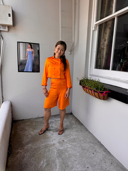 ALL NEW SEASON ORANGE SATIN CREPE DOUBLE BREASTED JACKET WITH BACK PEPLUM