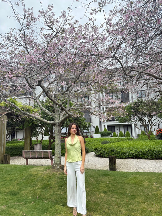 Chrystal Sloane Couture Apple Green Crinkle Satin Drape Neck Halter top