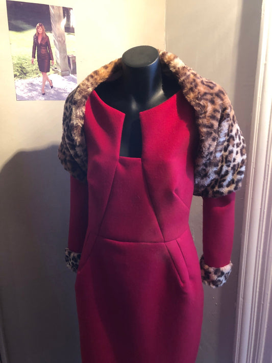 Chrystal Sloane Couture Winter Cardinal Red Wool Double Breasted Coat with Leopard Print Faux Fur Collar