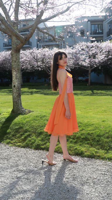 Chrystal Sloane Summer Cocktail Dress in Orange and Pink Brocade with Silk Chiffon Skirt.