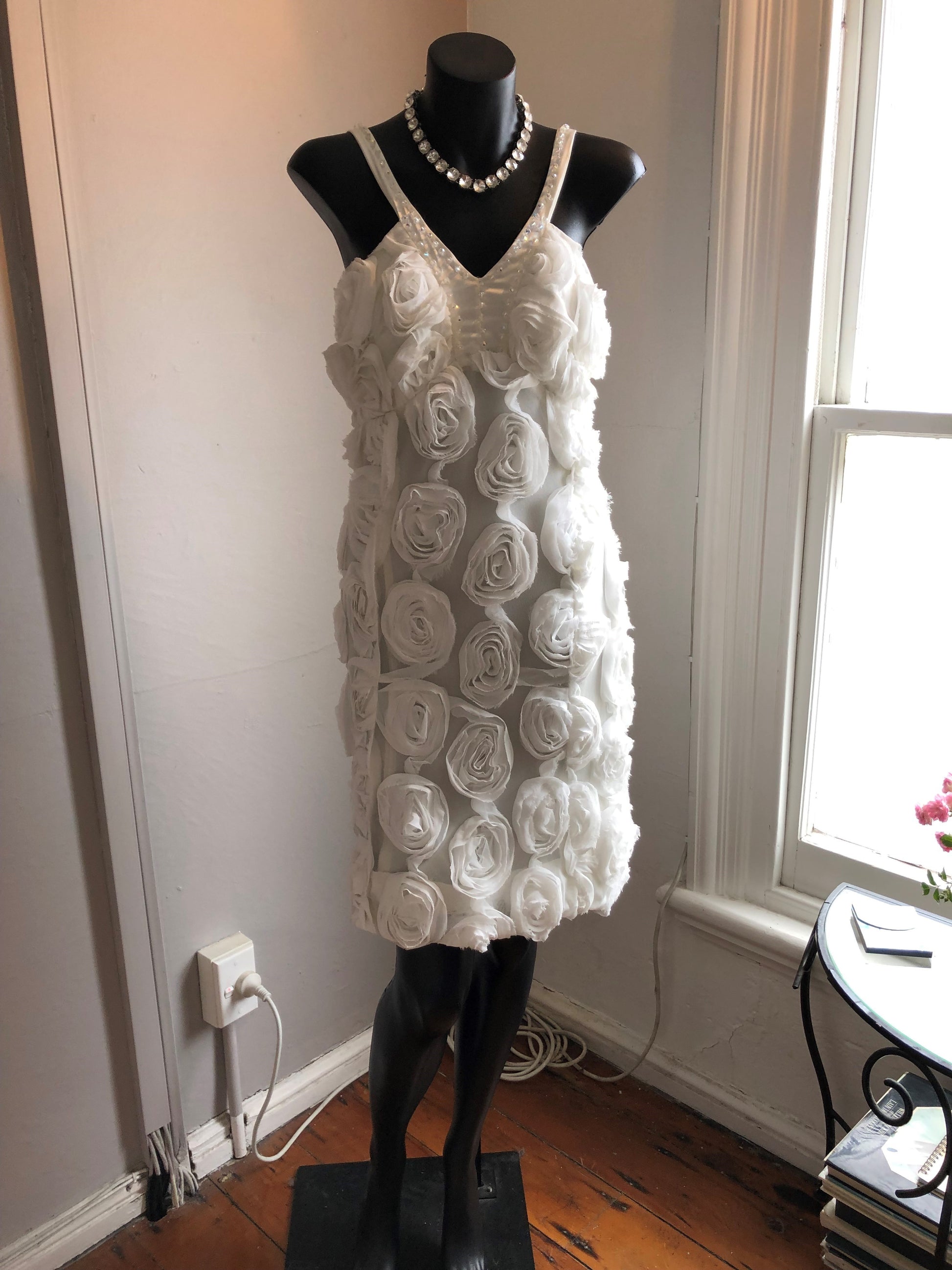 Chrystal Sloane Off White Appliqued Roses Cocktail Dress.