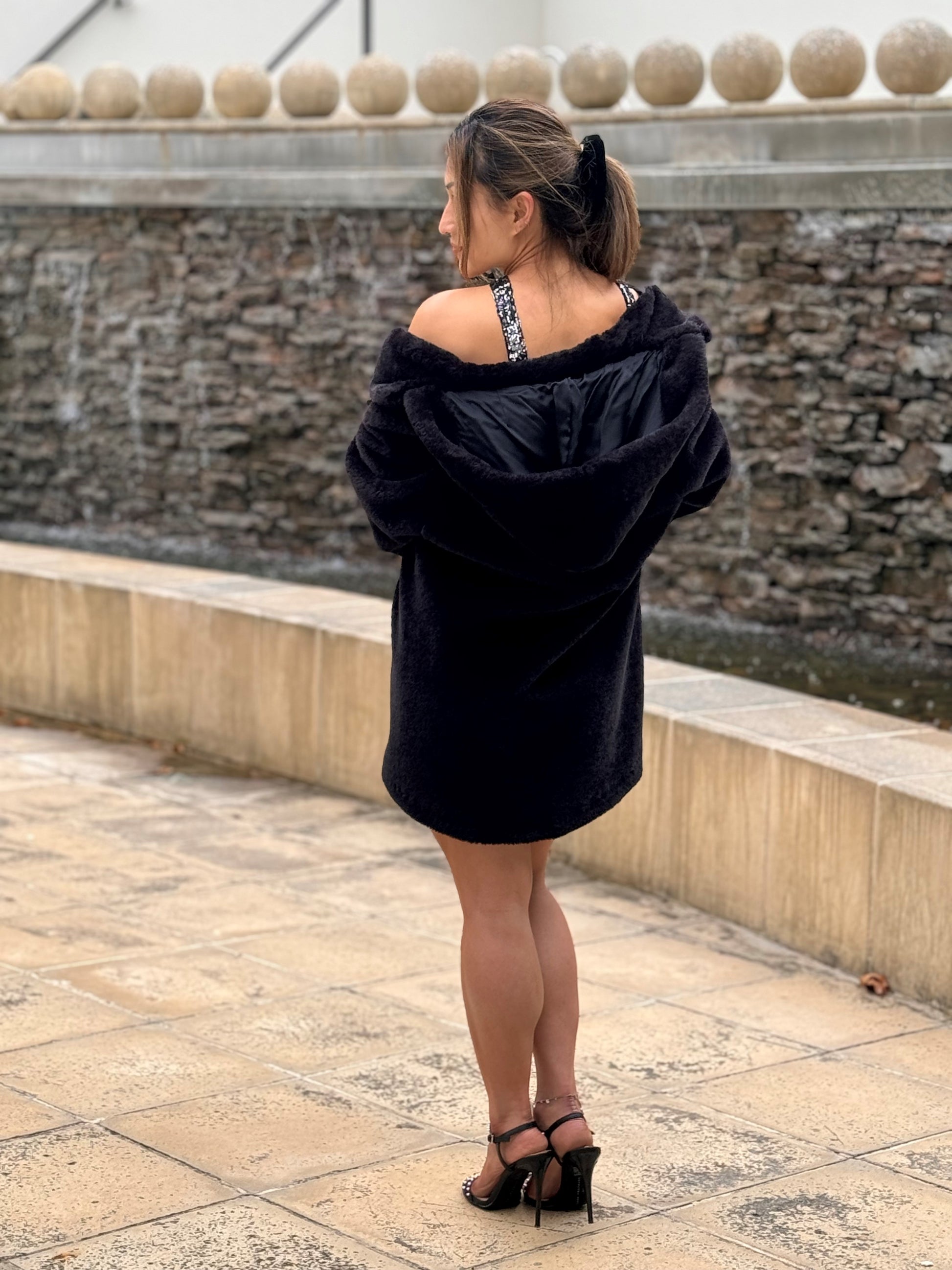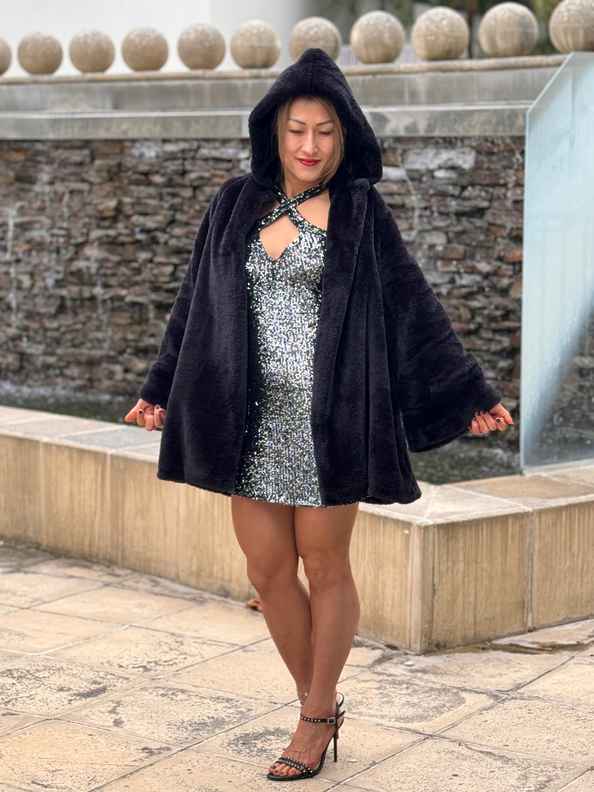Black 3/4 length faux fur swing coat with hood and cuffed belle sleeves. Perfect for Chilly nights out on the town. Teamed up with the Gold and Black sequined cocktail dress for a glammed up look.
