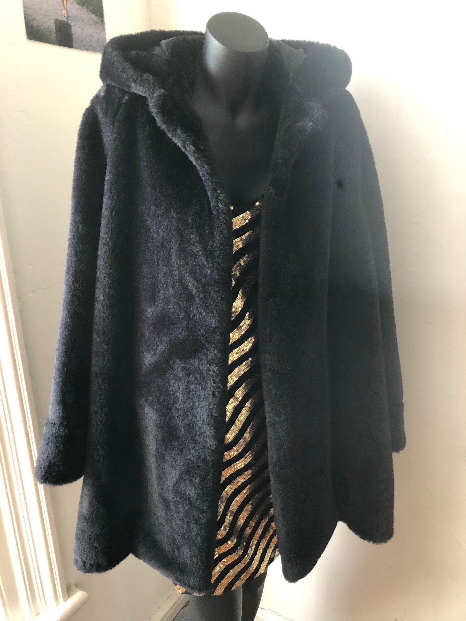 Chrystal Sloane Couture Black 3/4 Length Faux Fur Swing Coat with Hood.