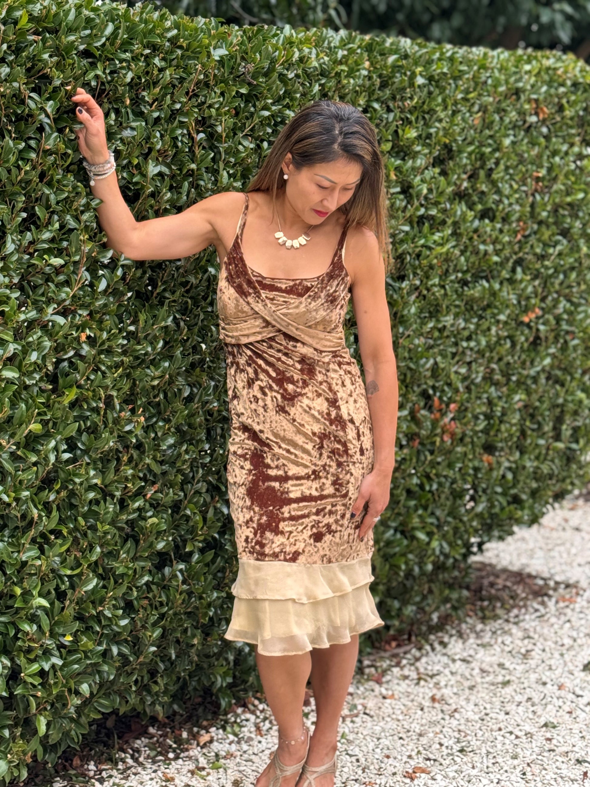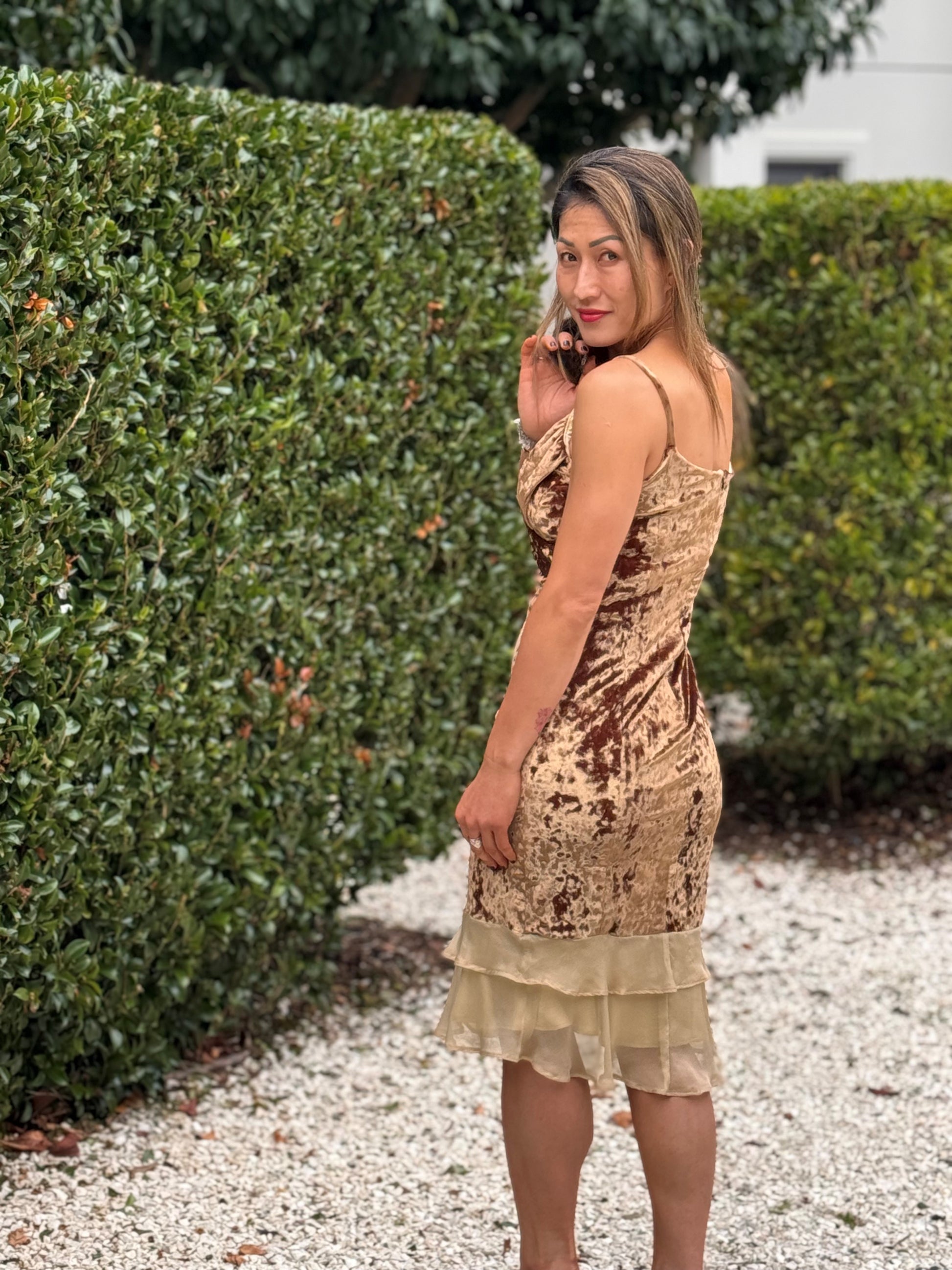Chrystal Sloane Couture Bronze Velvet Stretch Cocktail Dress with 2 tier flounces.