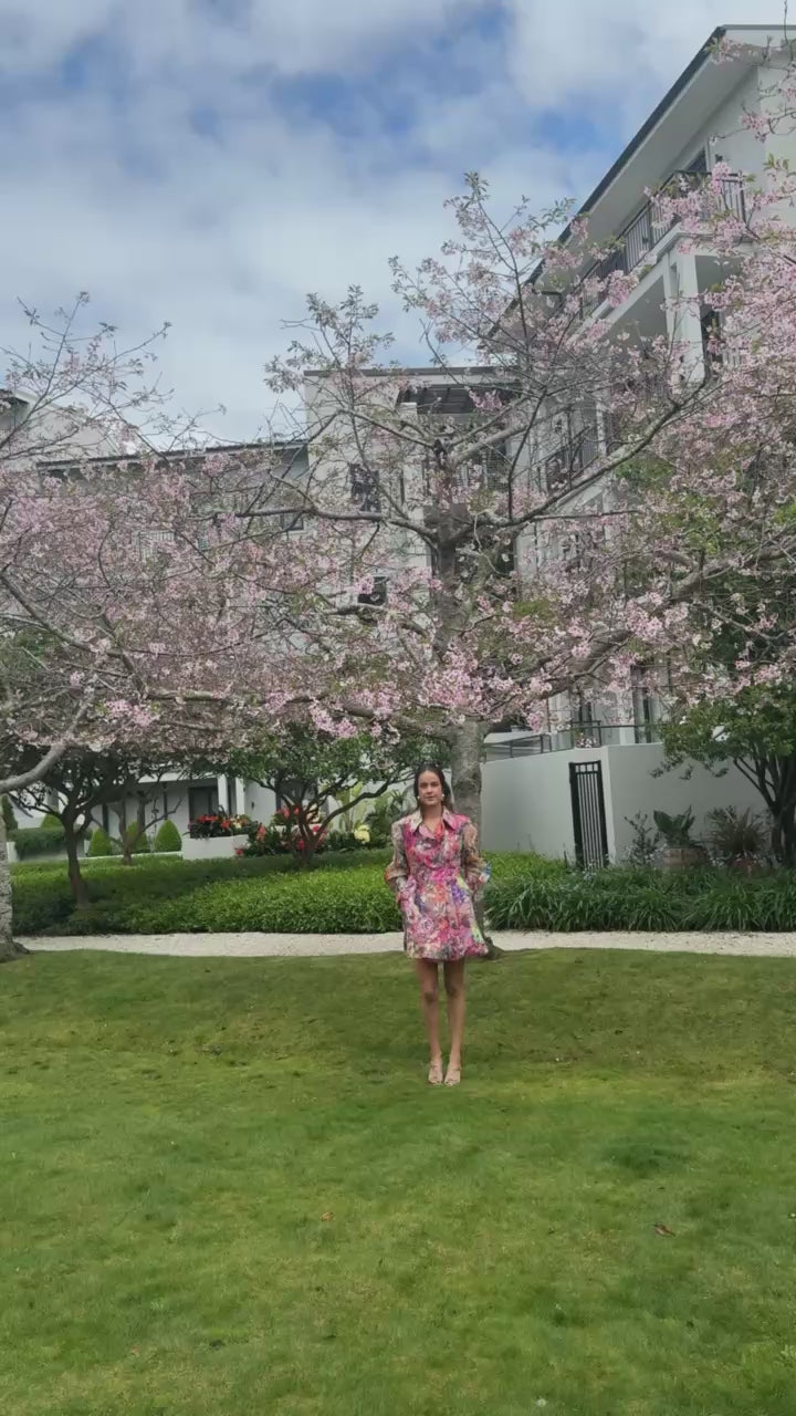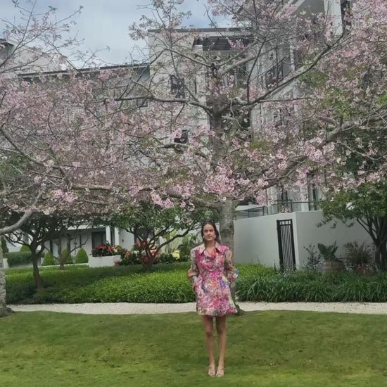 Chrystal Sloane Couture Embroidered Floral Organza double breasted coat dress with covered button detail on the front and leg of mutton style sleeve with side pockets. Lined with fuchsia pink sand wash silk. Perfect for the party season or summer wedding.