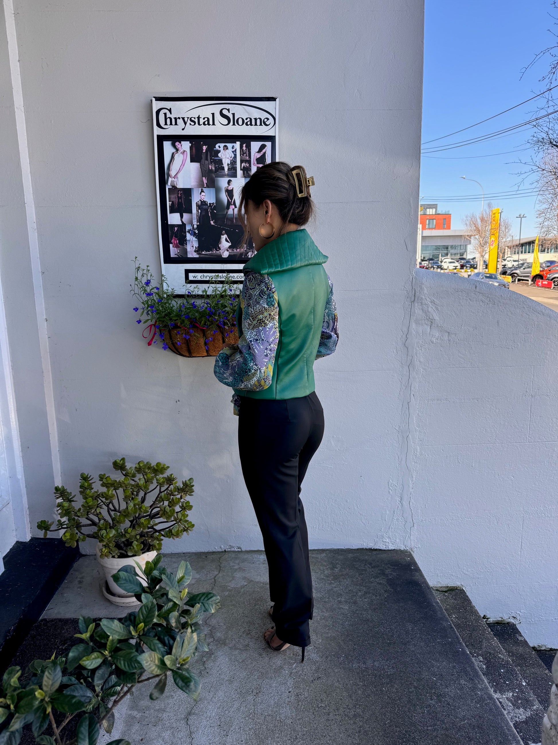 Chrystal Sloane Couture Emerald Green Leather Bomber Jacket Winter Magic Collection 2024