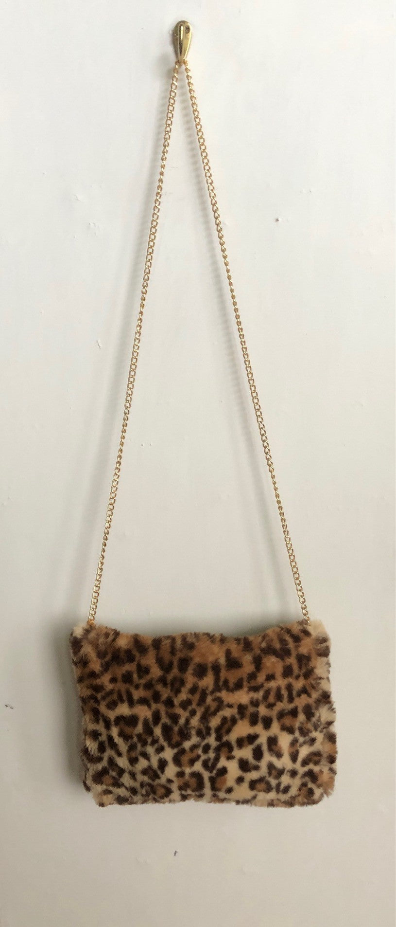 Chrystal Sloane Couture Leopard Print Faux Fur Shoulder Bag with gold chain. Add touch of glamour to your every day outfit.