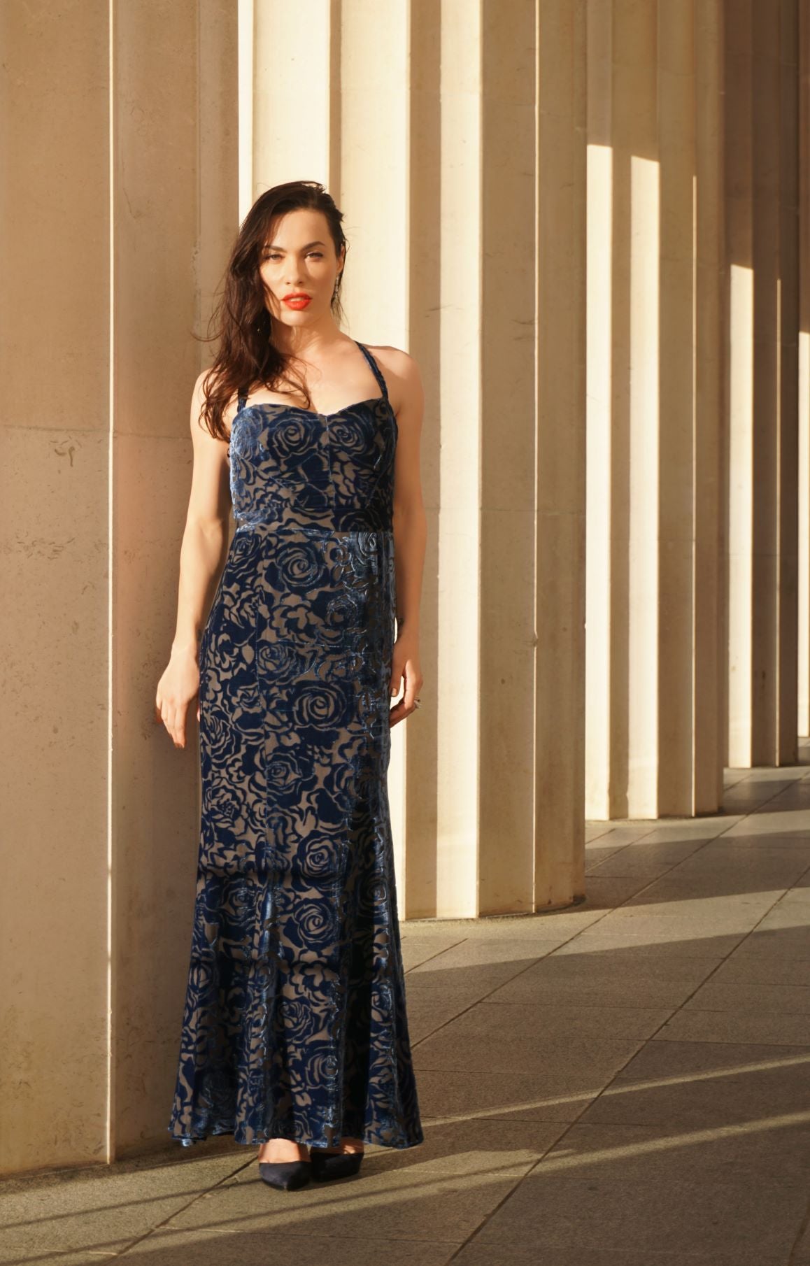 Chrystal Sloane Couture Ming Blue Voire Velvet Gown.