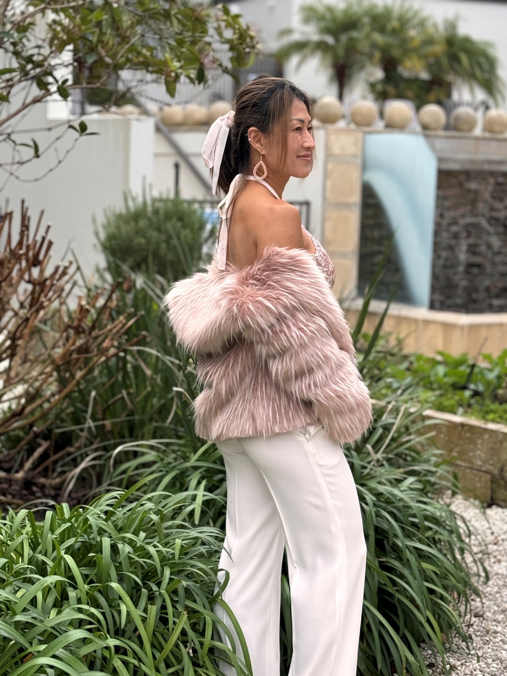 Chrystal Sloane Couture New Season Peach & Bronze Sequined Stretch Drawstring Halter Top with cream wide leg pant.