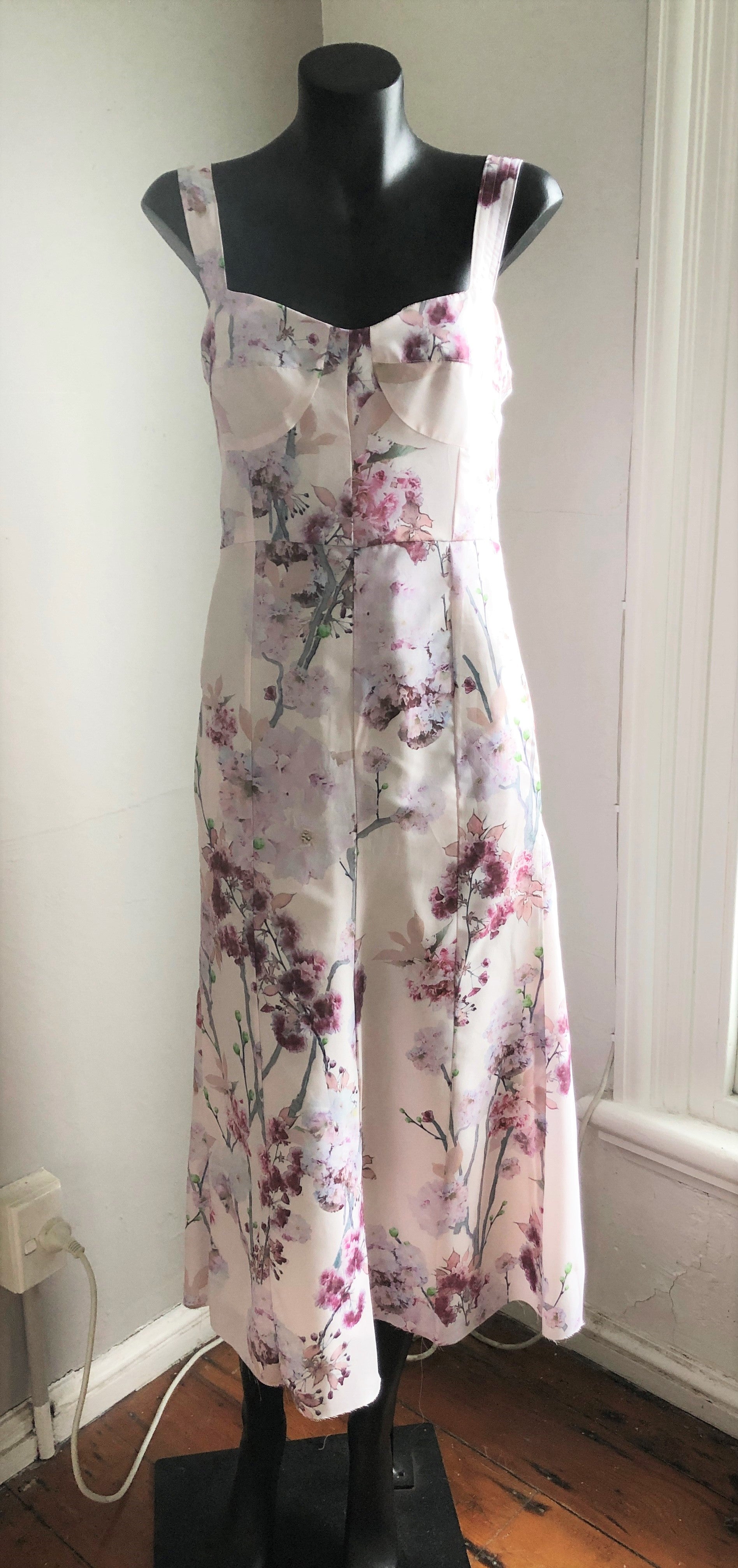 Chrystal Sloane Soft Pink Blossom Print Sundress with fitted bodice and paneled. Feminine and comfortable for everyday or dress up for a cocktail party.
