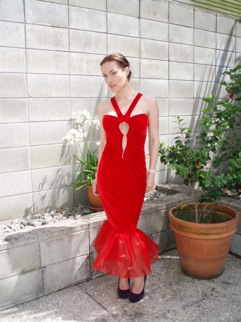 Chrystal Sloane Red Velvet Stretch Evening Gown with Organza Ruffle Hem.